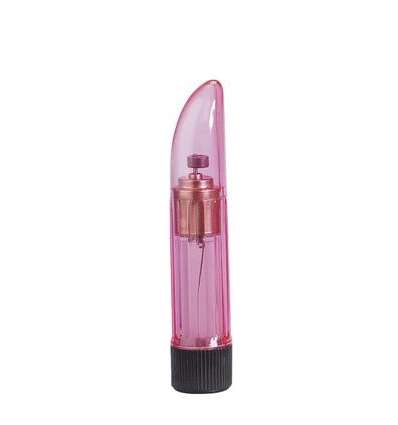 CRYSTAL CLEAR LADYFINGER PINK es un vibrador de plástico transparente de color rosa, con punta inclinada y base estriada.