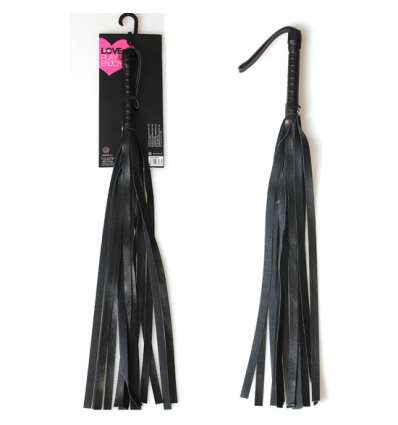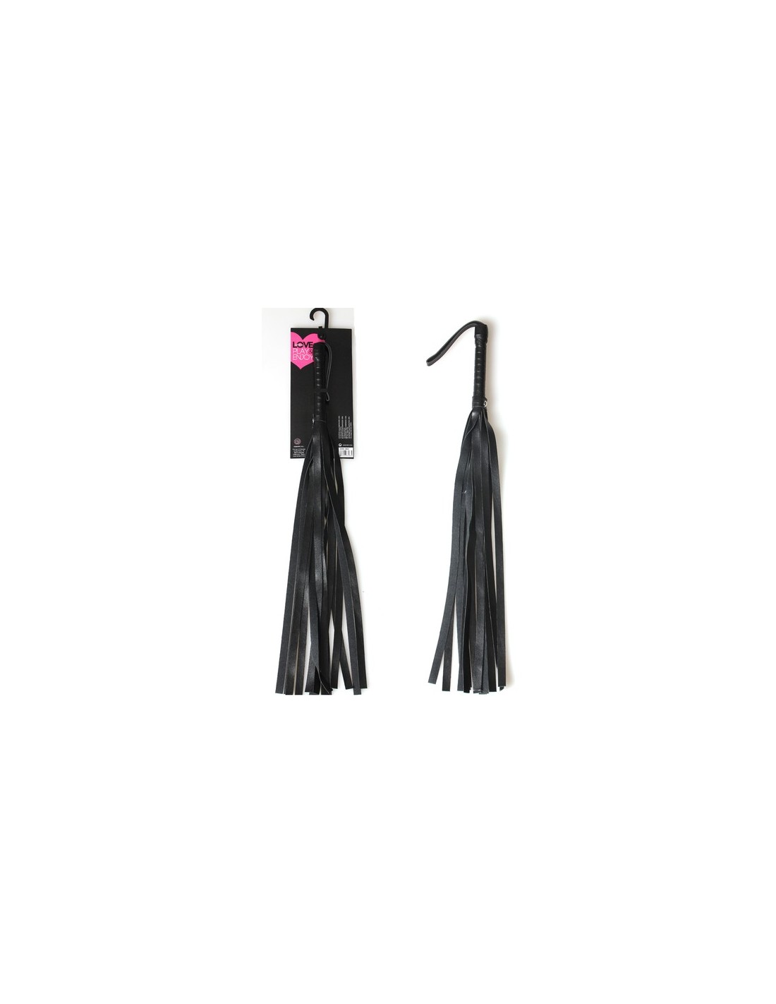 Discreto pero implacable látigo hecho en PVC negro, con mango rígido y flecos largos.