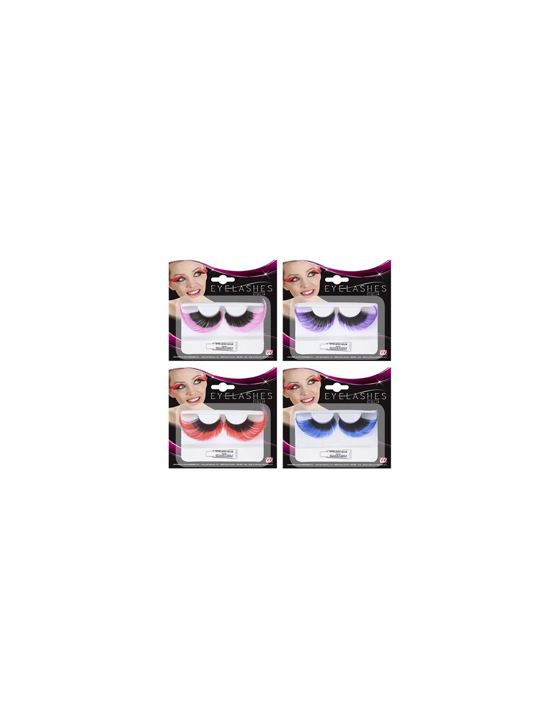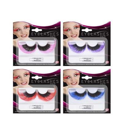 Fantástico pack de 12 pares de pestañas postizas Princess extra largas negras combinadas con colores variados.