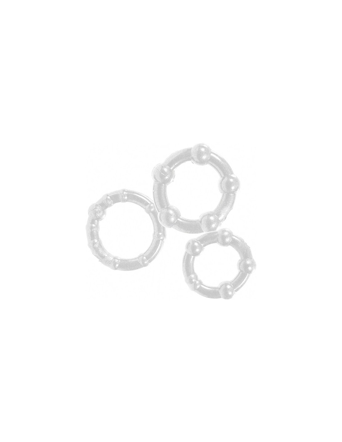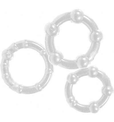 SEVEN CREATIONSSTAY HARD THREE RING SCLEAR es un kit de tres anillas de silicona de diferente tamaño, que se adaptan a cualquier tamaño de pene, con los que conseguirás que tu erección sea mucho más duradera, ya que los anillos permiten retardar la eyaculación y mantener tu pene erecto mucho más tiempo.