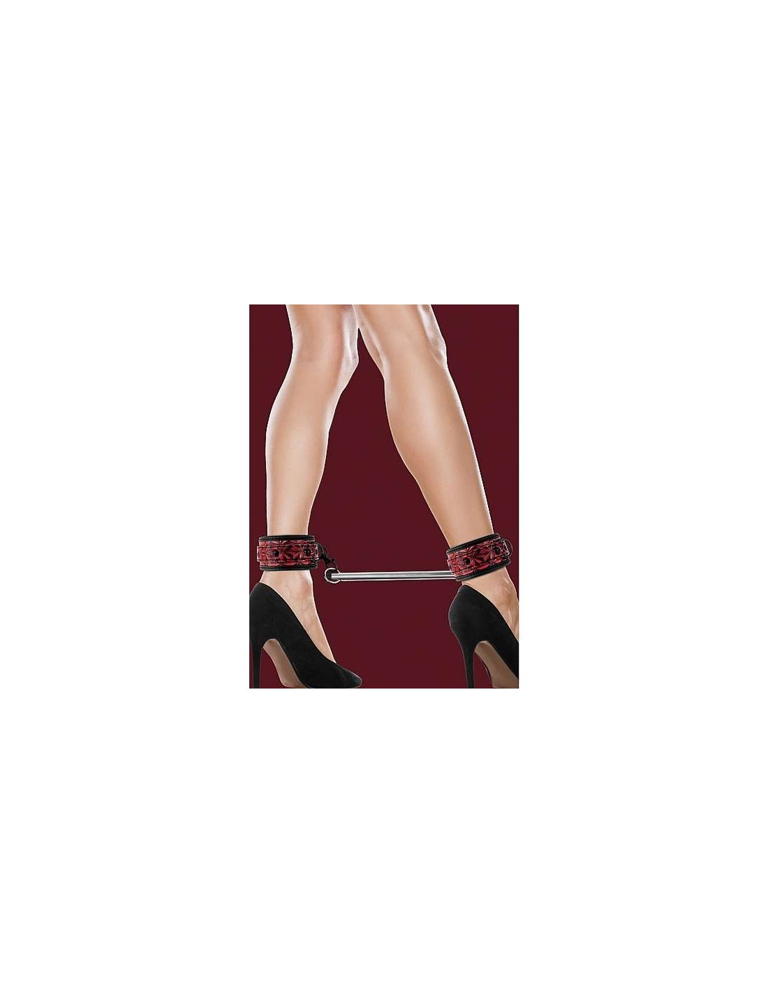 Esta fuerte barra separadora de metal se combina con dos esposas para los tobillos para que estés completamente expuesto y tengas una pícara diversión Las esposas están elaboradas de cómodo neopreno y vinilo patente con un estampado de diamantes ala moda.