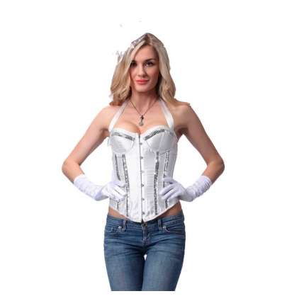 Corset blanco liso y decorado con lentejuelas color plata, cuello en forma de V, con tirantes que se ajustan a la nuca. Compuesto por varillas de plástico rigidas, con copa para el pecho y aros. El cierre trasero puede ser una lazada o cordón, el cierre delantero con corchetes y ballenas metálicas de acero inoxidable. Este set esta compuesto de 2pc corse y tanga.