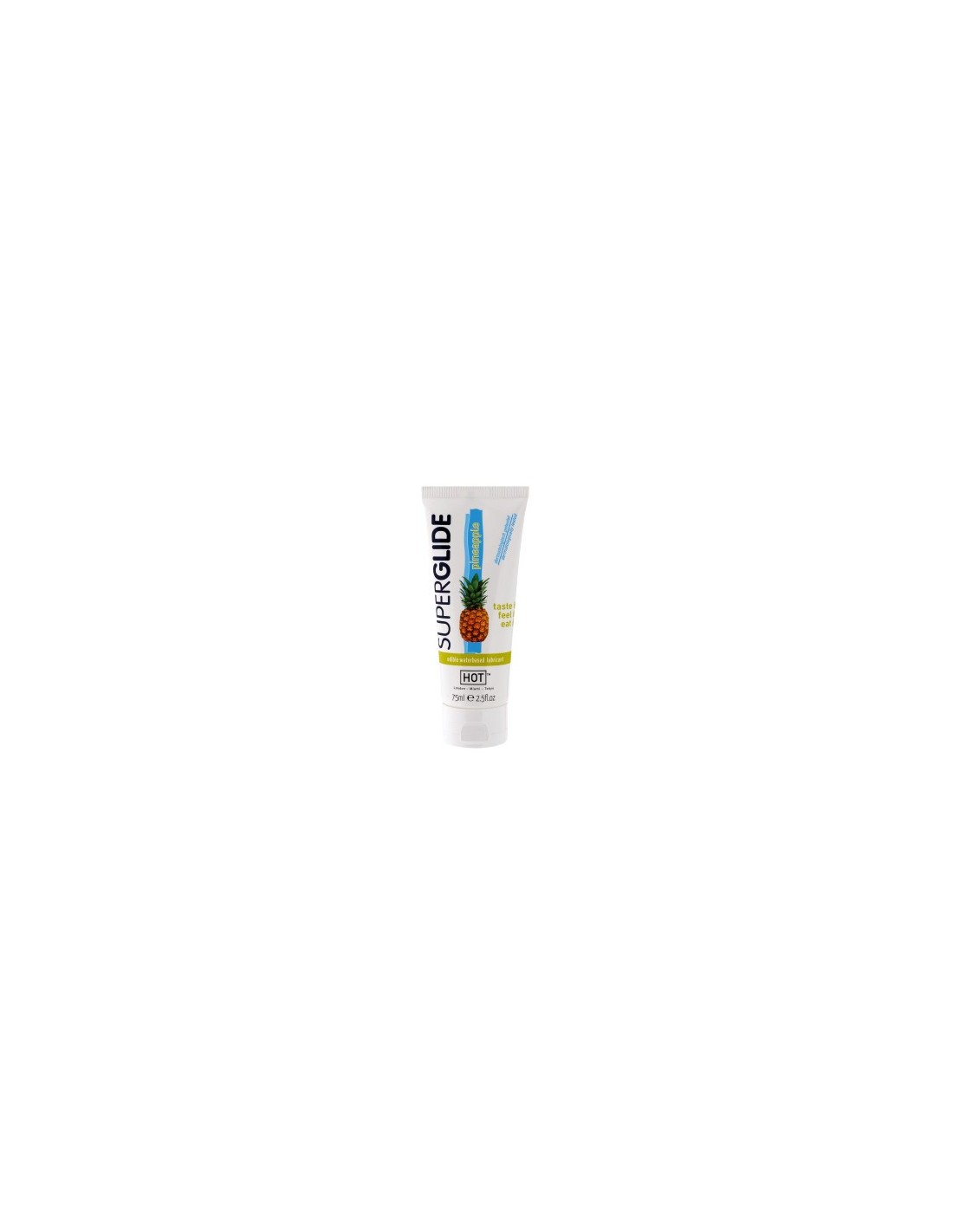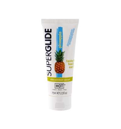 HOT SUPERGLIDE EDIBLE LUBRICANT PINEAPPLE es un lubricante comestible de base de agua de delicioso y excitante sabor.Pruébalo, Saboréalo, Comételo.Compatible con preservativos. Sabor a Piña.Cantidad: 75 ml.
