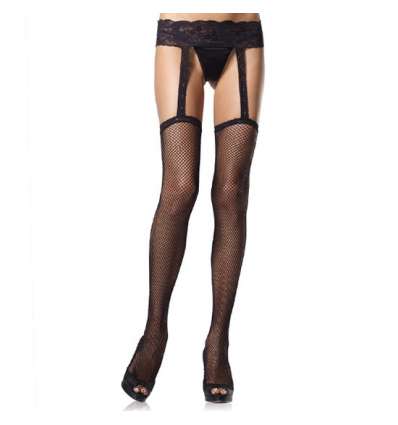 LEG AVENUE FISHNET STOCKINGS WITH ATTACHED LACE GATERBELT.