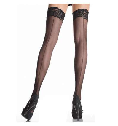 LEG AVENUE SHEER LACE TOP STOCKINGS WITH BACKSTEAM PLUS.